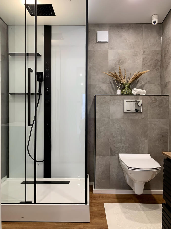 Сантехника монтируется со скрытой разводкой и инсталляцией. По умолчанию санузел отделан керамогранитом — практично и стильно.